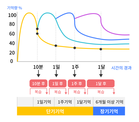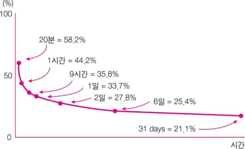 - 학습 20분 후, 외운 내용의 42%를 잊어버렸다.