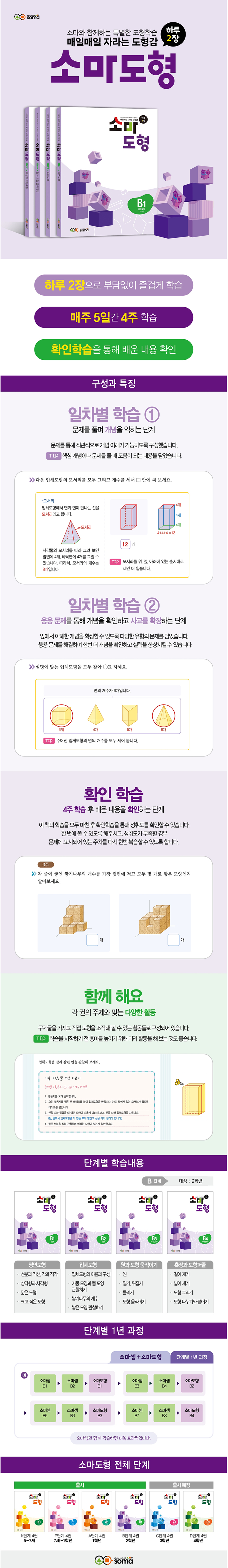 “도형 학습의 시작은 소마 도형과 함께“유 · 아동기는 공간 감각을 기를 수 있는 ‘결정적 시기'다. 선천적으로 공간 감각이 뛰어나지 않더라도 유 · 아동기에 어떤 것을 경험하고 접하느냐의 차이가 후에 초등 고학년, 중 · 고등에서 공간 감각의 차이로 나타나기도 한다. 따라서, 유아기에는 다양한 경험을 할 수 있도록 하고, 아동기에는 체계적인 학습을 시작하는 것이 중요하다. 소마도형은 5세부터 초등 5학년까지의 학생들을 대상으로 초등 전과정의 도형 파트를 다루는 도형 학습서다. 각 단계별로 평면도형, 입체도형, 도형조작, 측정의 4개 영역으로 나누어, 해당 학습 연령에 최적화된 주제와 접근 방식으로 아이들의 공간 감각과 사고력을 기를 수 있도록 구성하였다. 하루 2장씩 즐겁게 학습하다보면, 〈일차별학습 → 활동 → 확인학습〉을 통해 자연스럽게 개념습득과 응용학습, 복습이 이루어지도록 체계적으로 구성되어 있다.