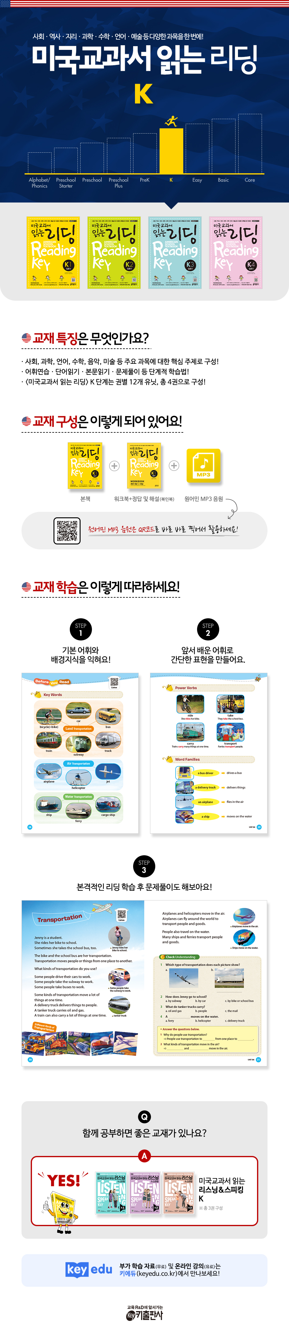키출판사에서는 미국 교과서라는 텍스트를 주축으로 영어의 네 가지 역량(4Skills)을 골고루 성장시킬 수 있는 다차원적인 영어 학습 환경을 제공합니다. 키출판사가 직접 운영하는 영어 교육 사이트 잉글리시버스(www.englishbus.co.kr)에서는 〈미국교과서 읽는 리딩〉시리즈를 원어민 강의와 함께 학습할 수 있습니다. 또, 리드톡(www.readtalk.co.kr)에서는 1:1 화상영어로 원어민 선생님에게 Speaking 훈련과 Writing 첨삭 지도를 받을 수 있습니다. 이제 미국교과서 읽는 리딩 교재, 원어민 인터넷강의, 원어민 화상(전화)영어로 네 가지 역량을 확실하게 잡으세요!