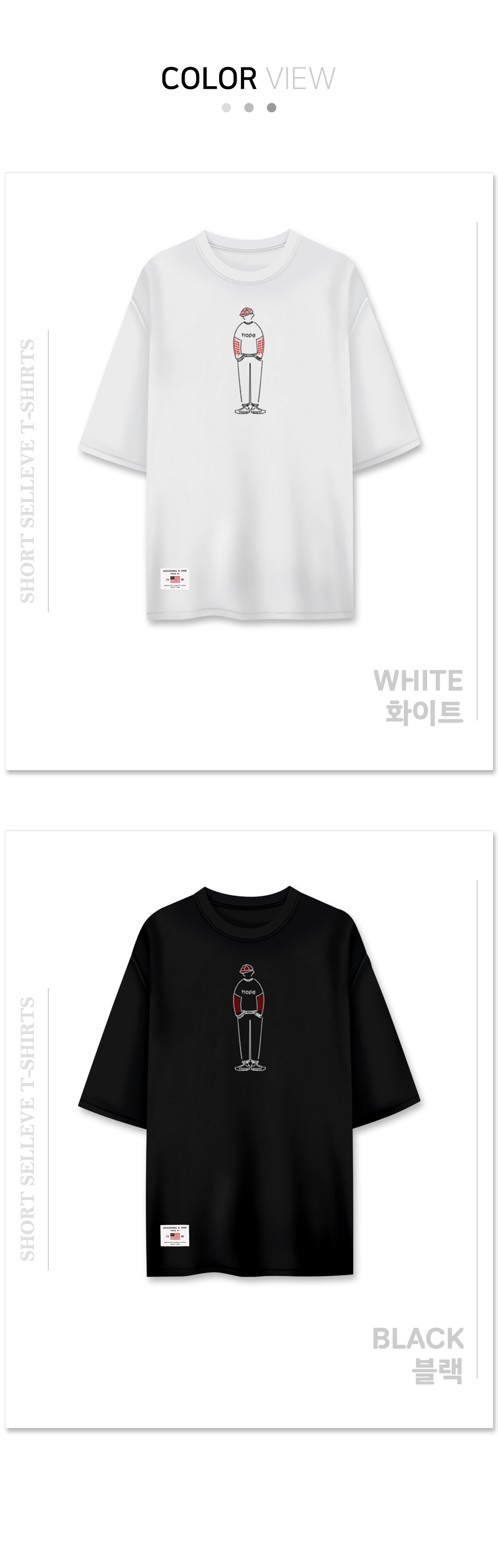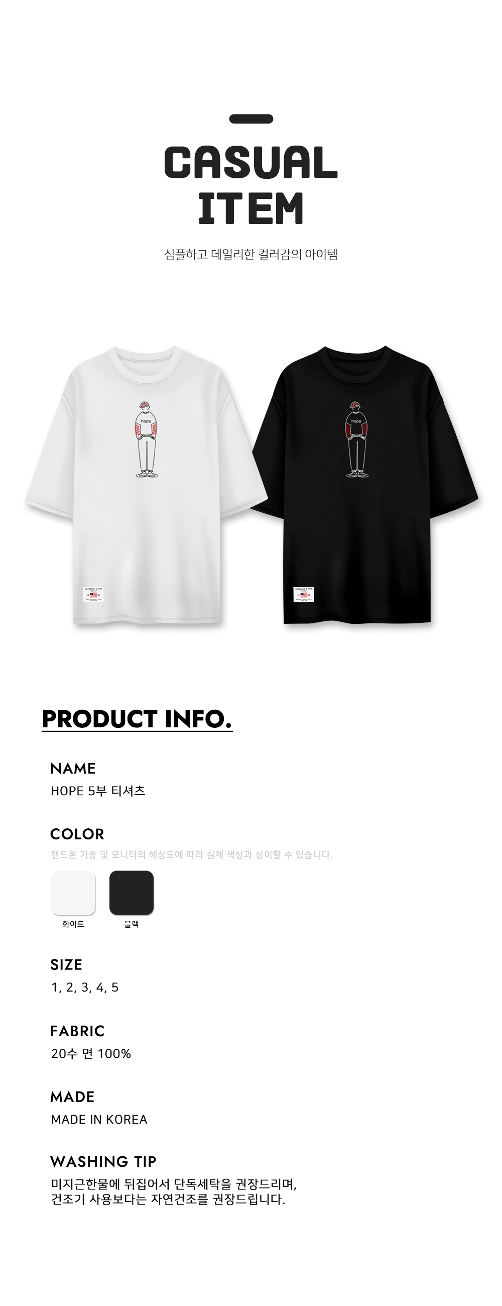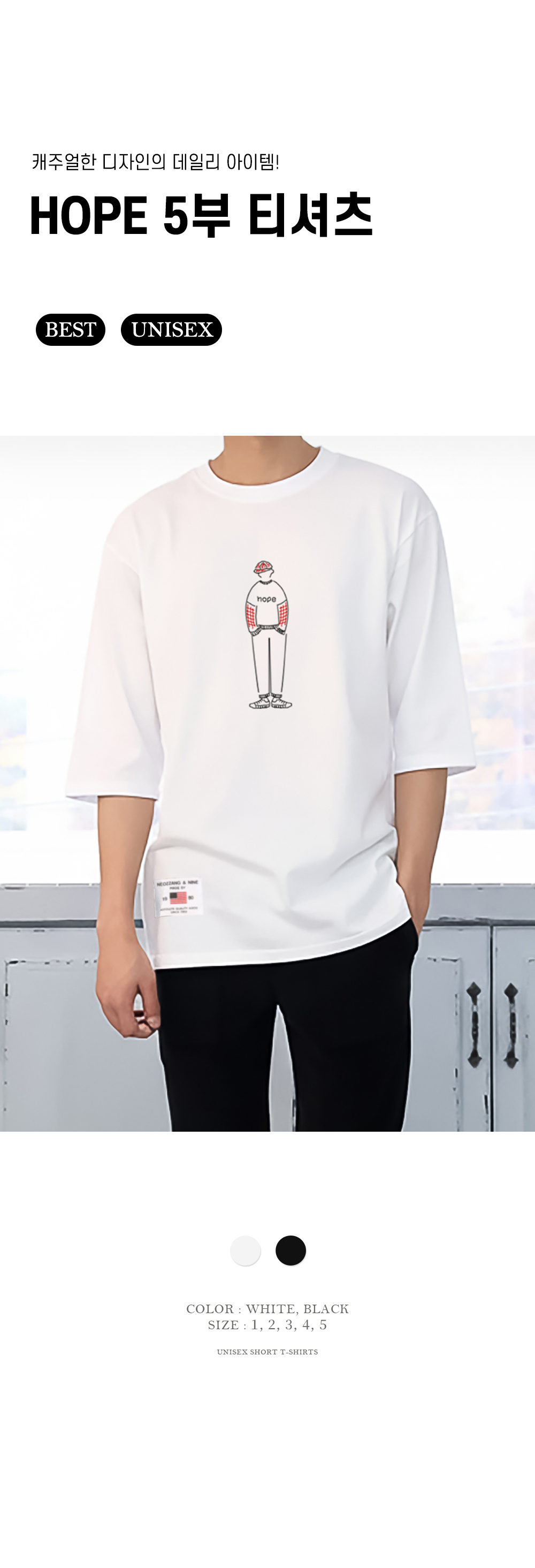 [1+1] HOPE 5부 반팔 티셔츠 남여공용 20수 면 반소매 티셔츠