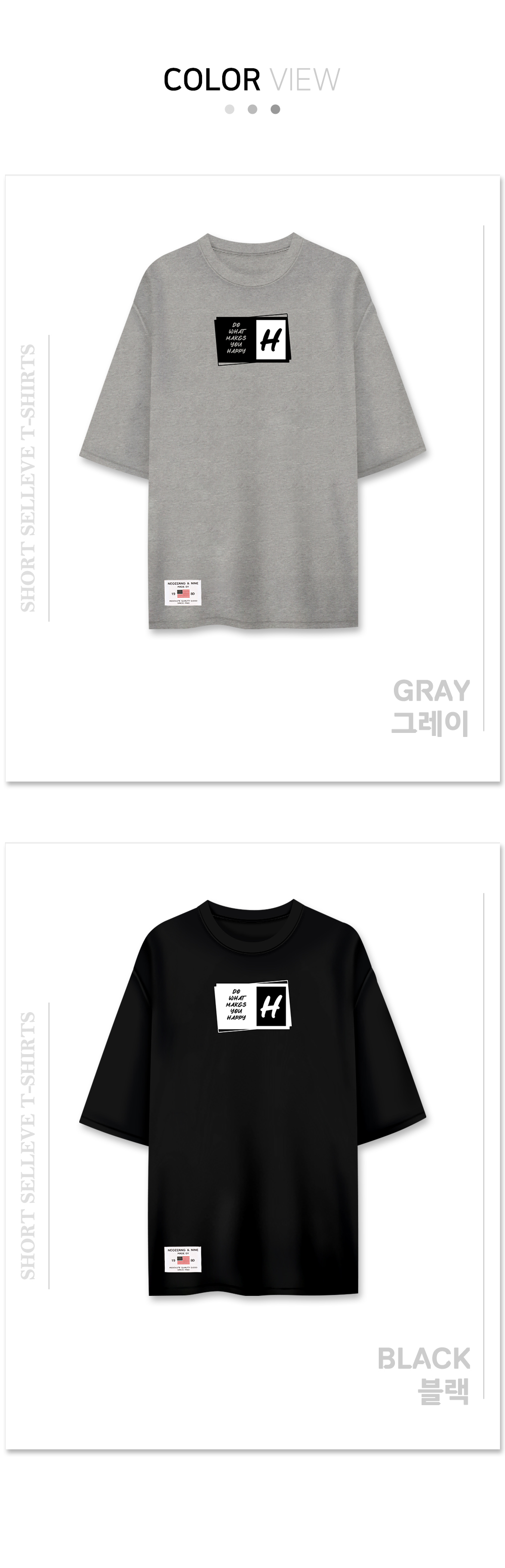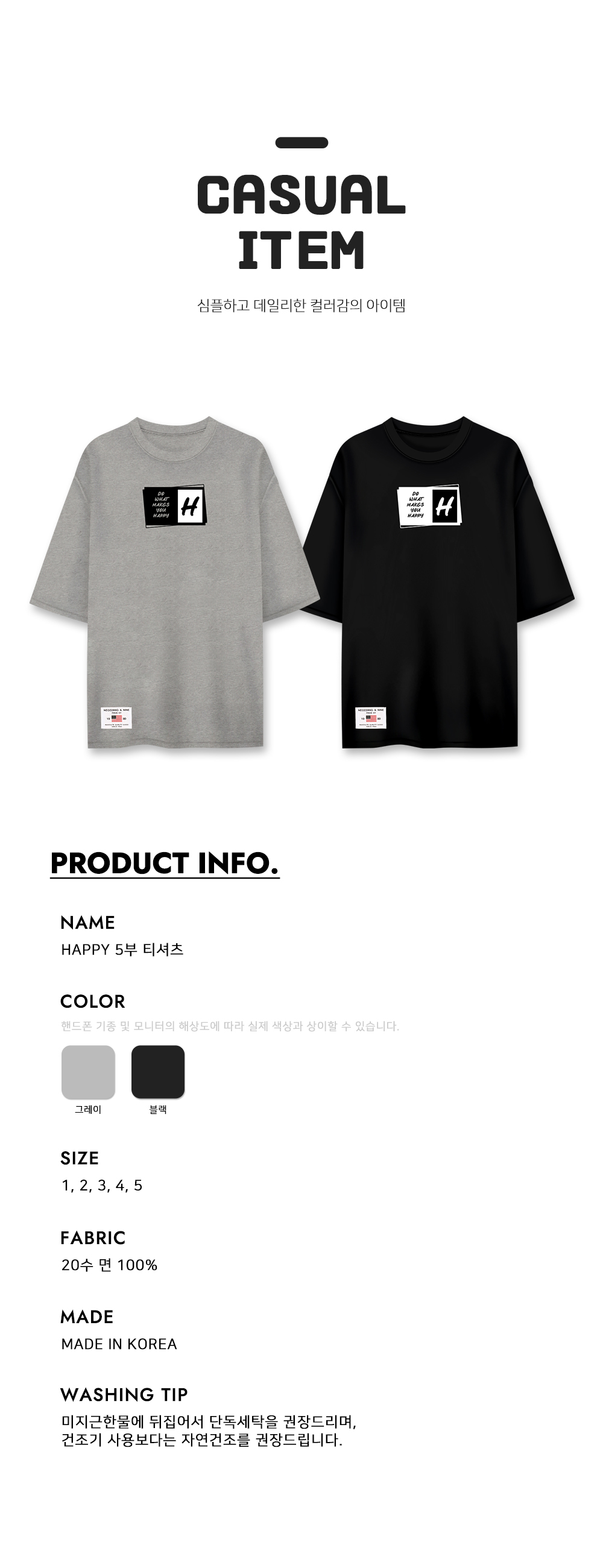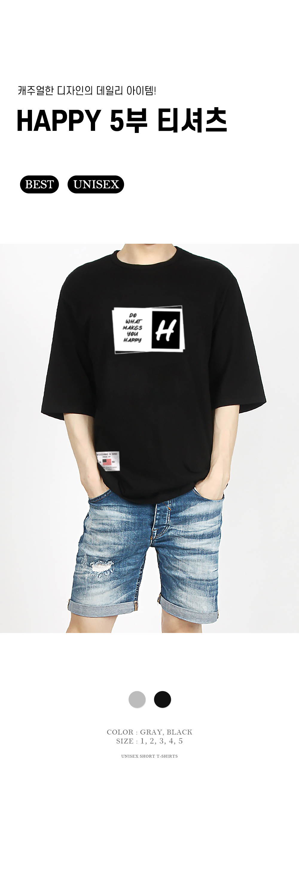 [1+1] HAPPY 5부 반팔 티셔츠 남여공용 20수 면 반소매 티셔츠