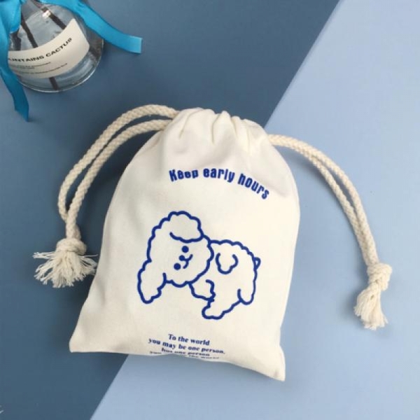 누구나 쉽게 사용할 수 있는 조리개 타입으로 데일리 아이템을 넣거나 화장품 또는 여행용 파우치로 사용하기 좋은 귀여운 강아지 일러스트 파우치